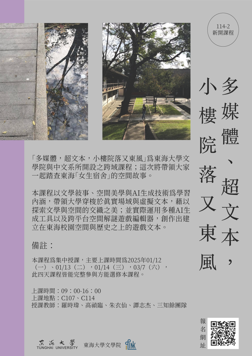 「多媒體,超文本,小樓院落又東風」為東海大學文學院與中文系所開設之跨域課程;這次將帶領大家一起踏查東海「女生宿