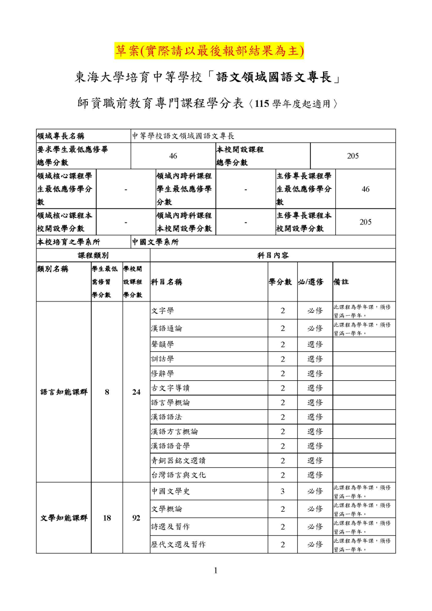 《語文領域國語文專長》師資職前教育專門課程學分表修訂案 說明 本系於民國115年2月25日召開之系務會議中,業已審議並通過《東海大學培育中等學校「語文領域國語文專長」師資職前教育專門課程學分表》修訂案。後續將由本校師資培育中心依相關規定辦理報部程序。 本表之最終內容,仍以教育部審核通過版本為準,特此公告周知。