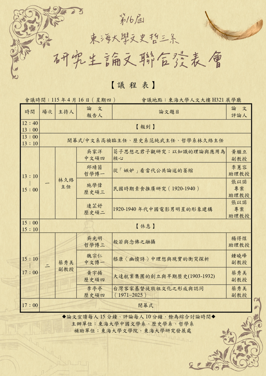 東海大學中文系--系所公告 -第16屆東海大學文史哲三系研究生論文聯合發表會