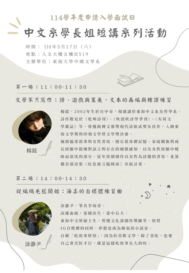 將邀請幾位東海中文系優秀的在校生,親自現身分享他們在校期間於不同領域的學習心得與經驗。