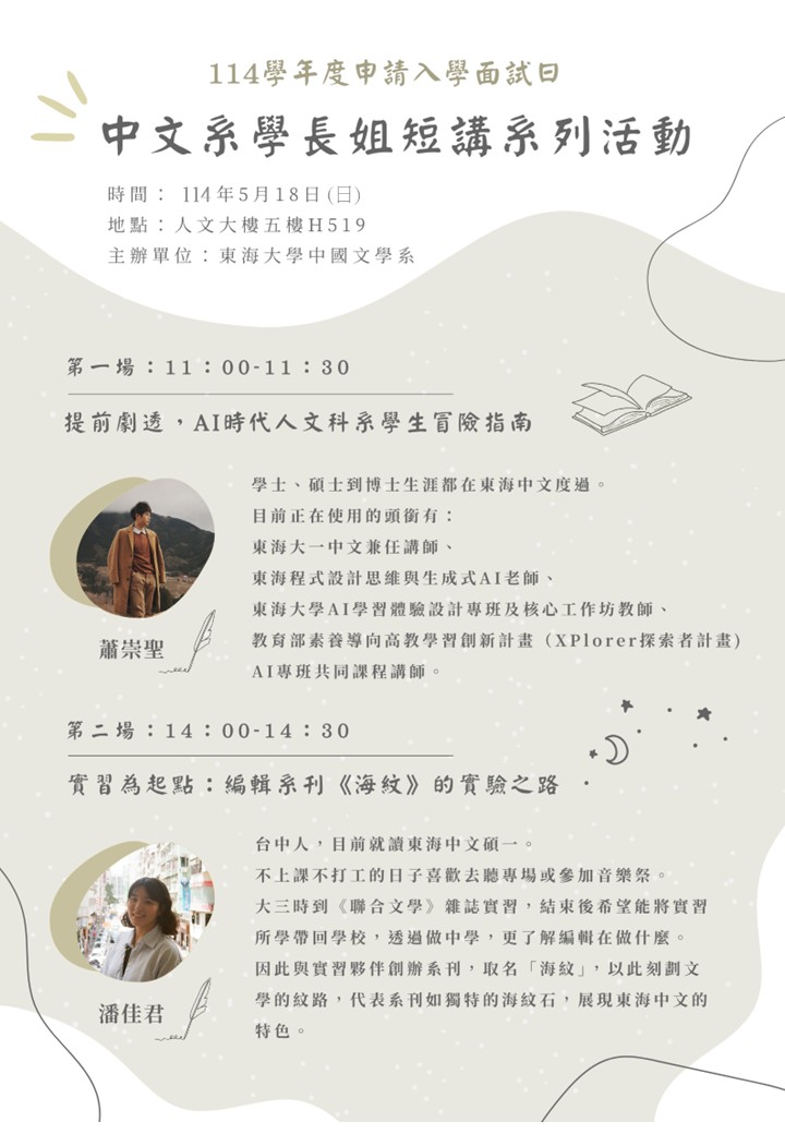 5/17、5/18申請入學面試日—中文系學長姊短講系列活動