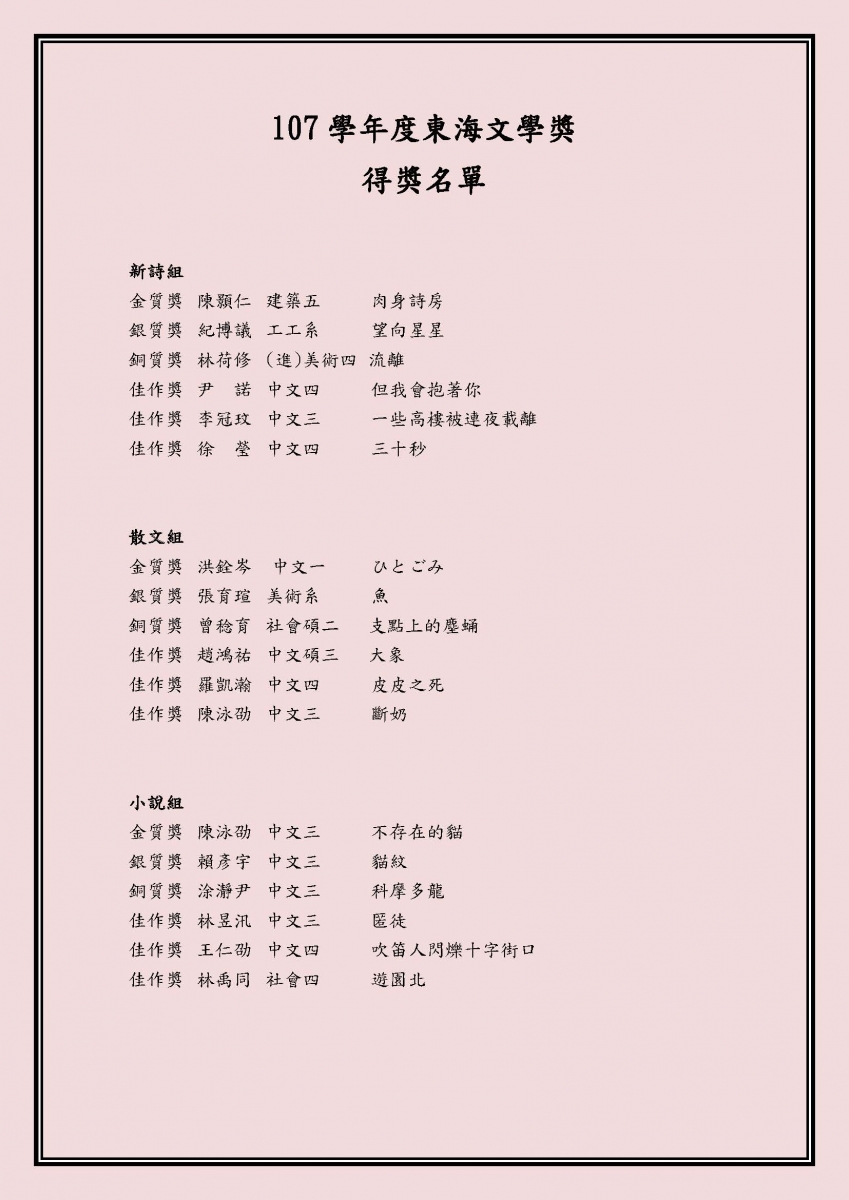 東海大學中文系--學術活動-107學年度東海文學獎得獎名單