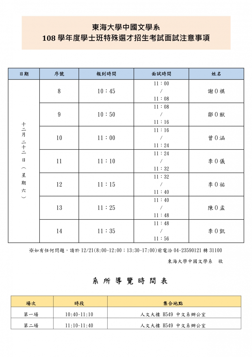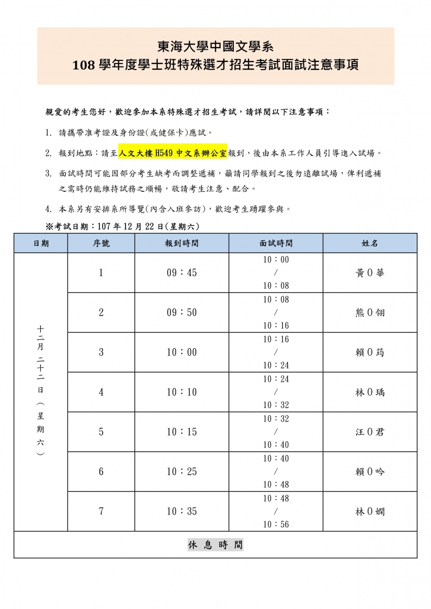 108學年度東海大學中國文學系特殊選才招生考試面試注意事項