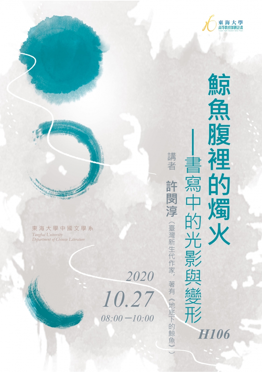 【演講資訊】 日 期:2020/10/27 時 間:08:00-10:00 地 點:H106 講 題:鯨魚腹裡的燭火──書寫中的光影與變形 講 者:許閔淳 講者介紹:臺灣新生代作家,著有《地底下的鯨魚》。