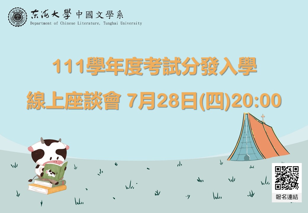 111學年度考試分發入學 線上座談會 7月28日(四)20:00 各位同學好~ 感謝大家對於東海中文系的支持與厚愛,也歡迎選擇就讀東海中文系。 我們將於111年7月28日 晚間20:00~21:00,為分發入學的考生舉辦線上座談會,與您一同分享東海中文系的特色、課程及相關就學資訊。