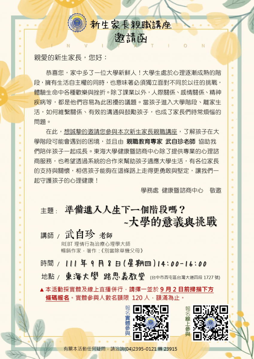 東海大學中文系---9/8 新生家長親職講座