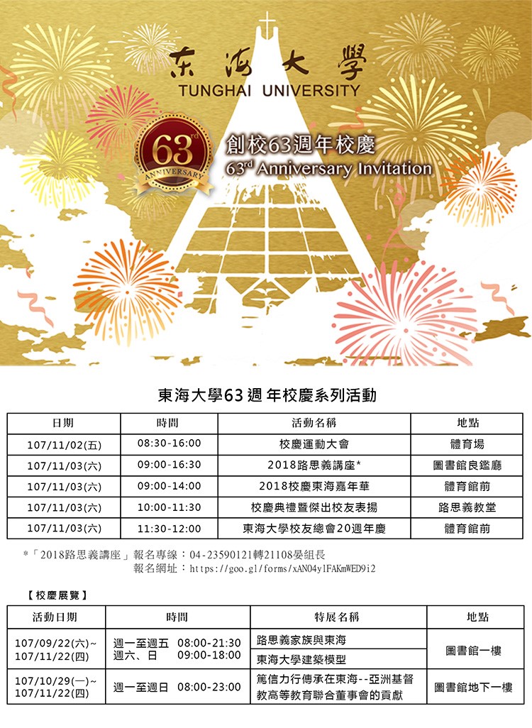本校欣逢創校63週年,謹訂107年11月2日(星期五)及11月3日(星期六)舉行系列慶祝活動,歡迎踴躍共襄參與。